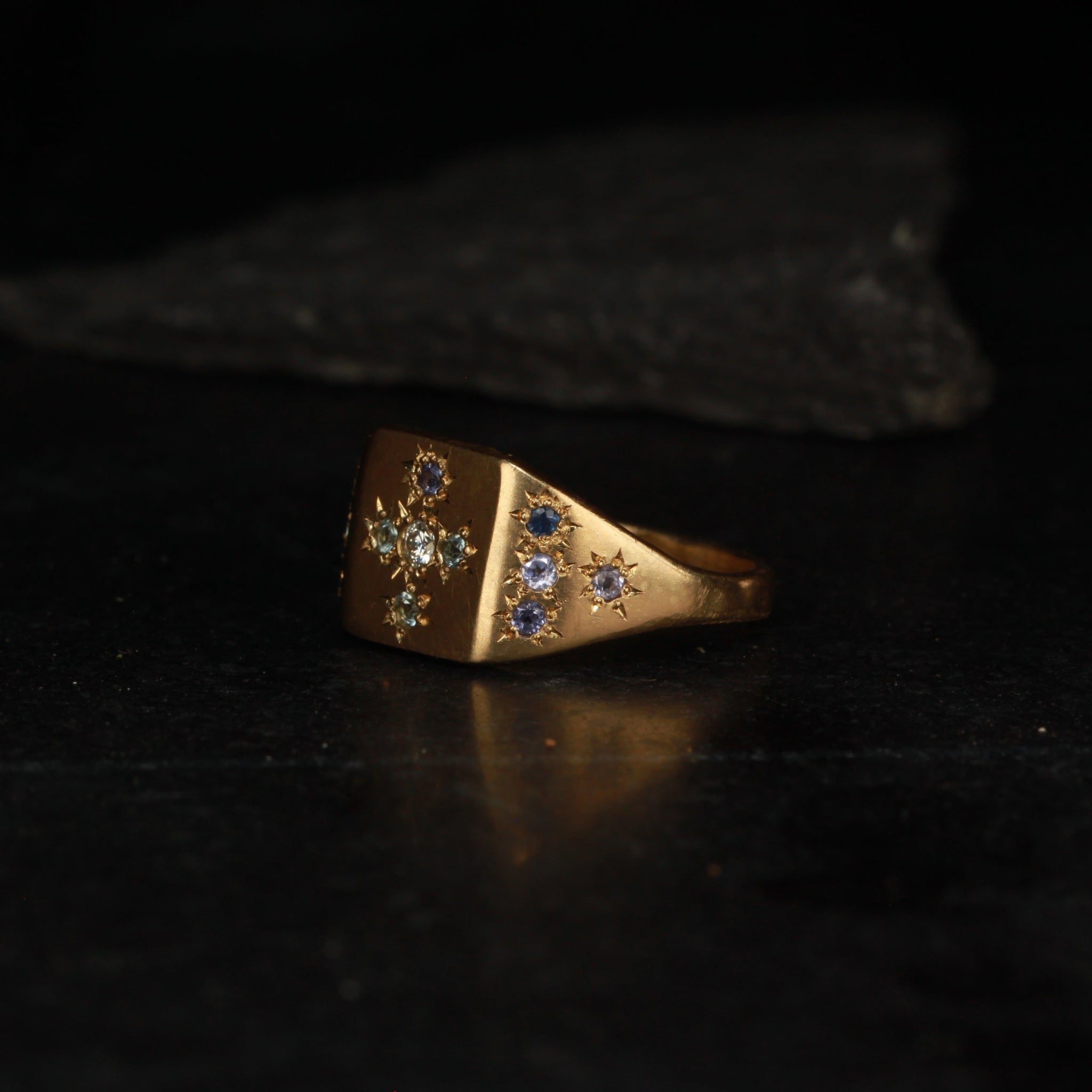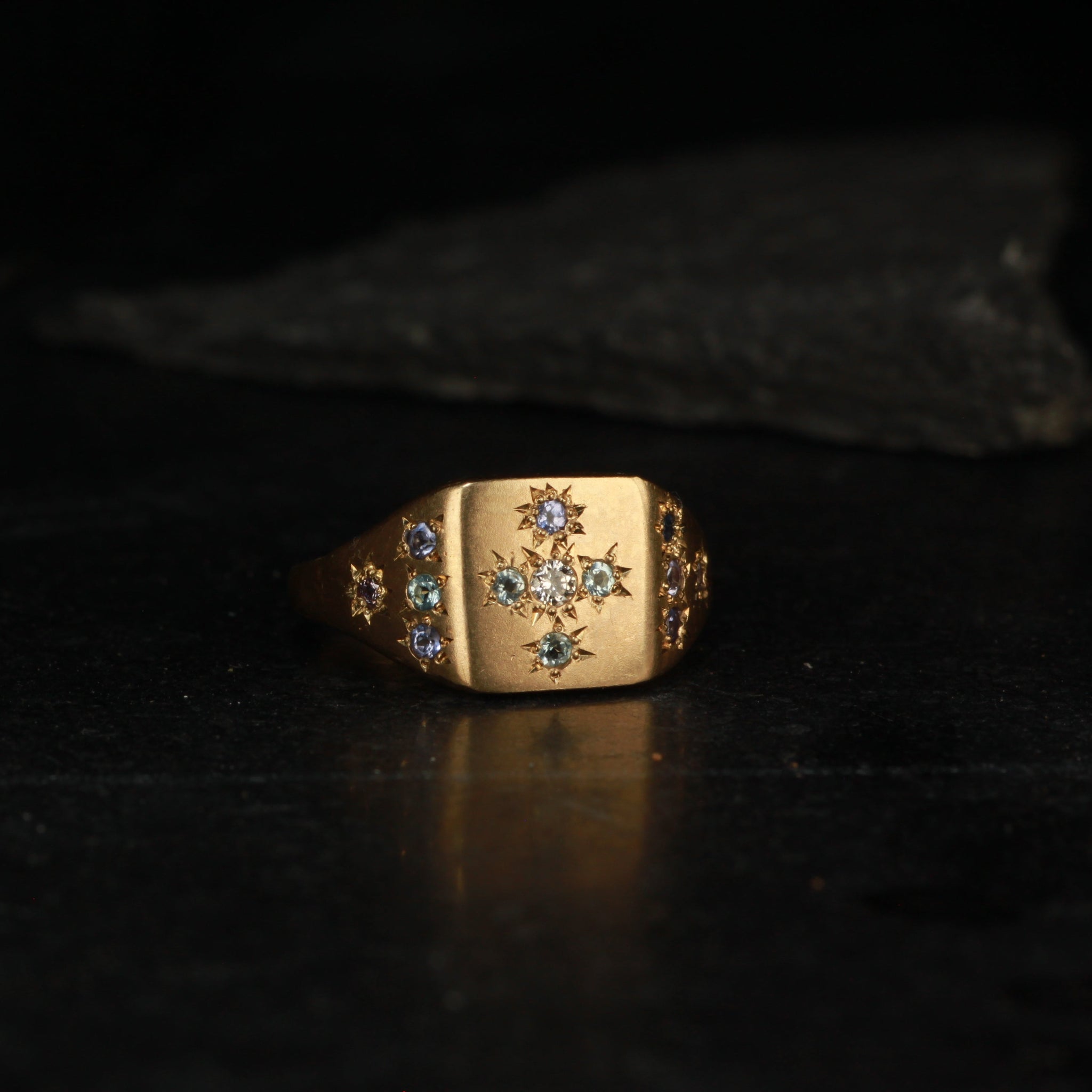 Solid 9k gold signet with center VVS natural diamond, Four natural light blue topaz, one natural blue sapphire, and 7 natural tanzanite stones set.