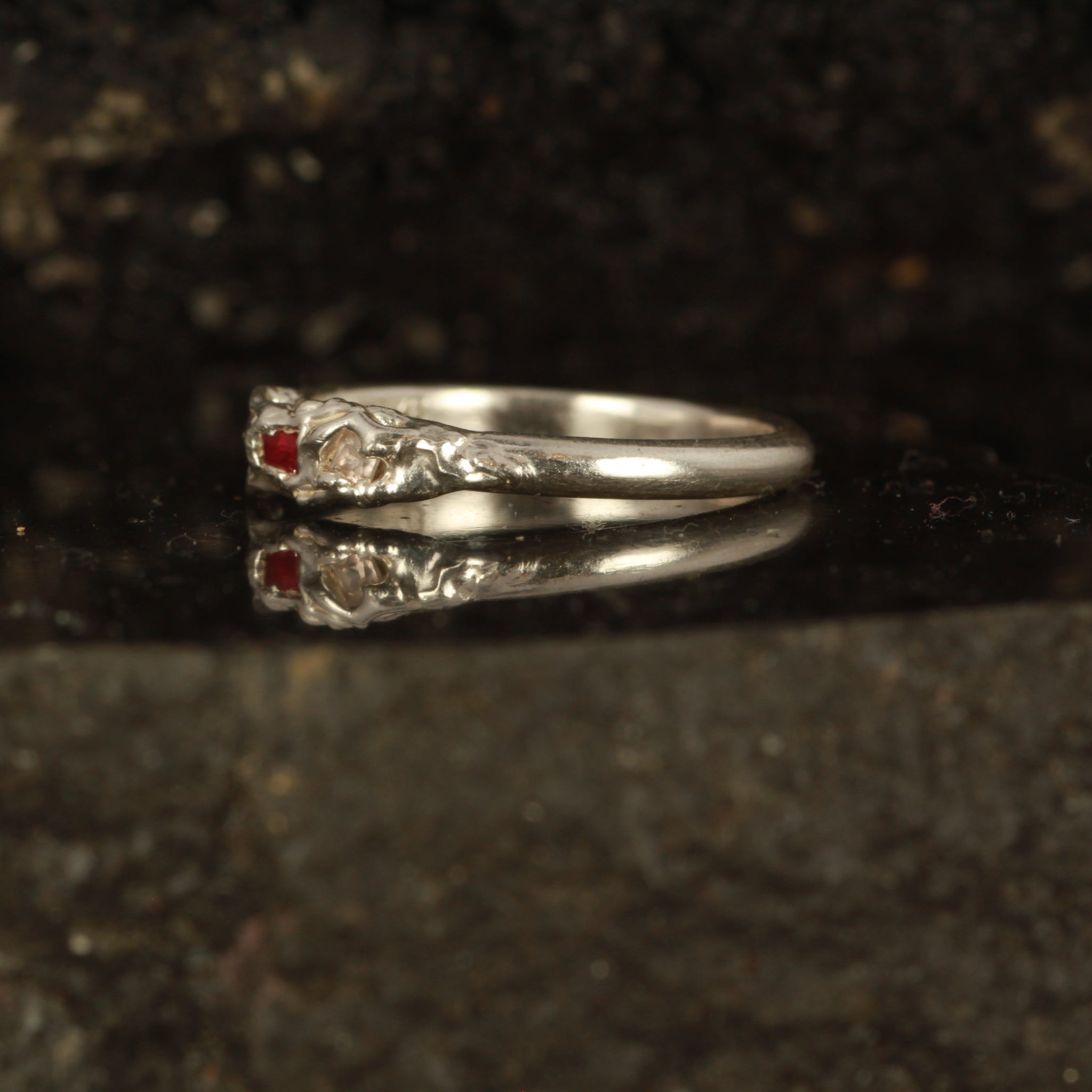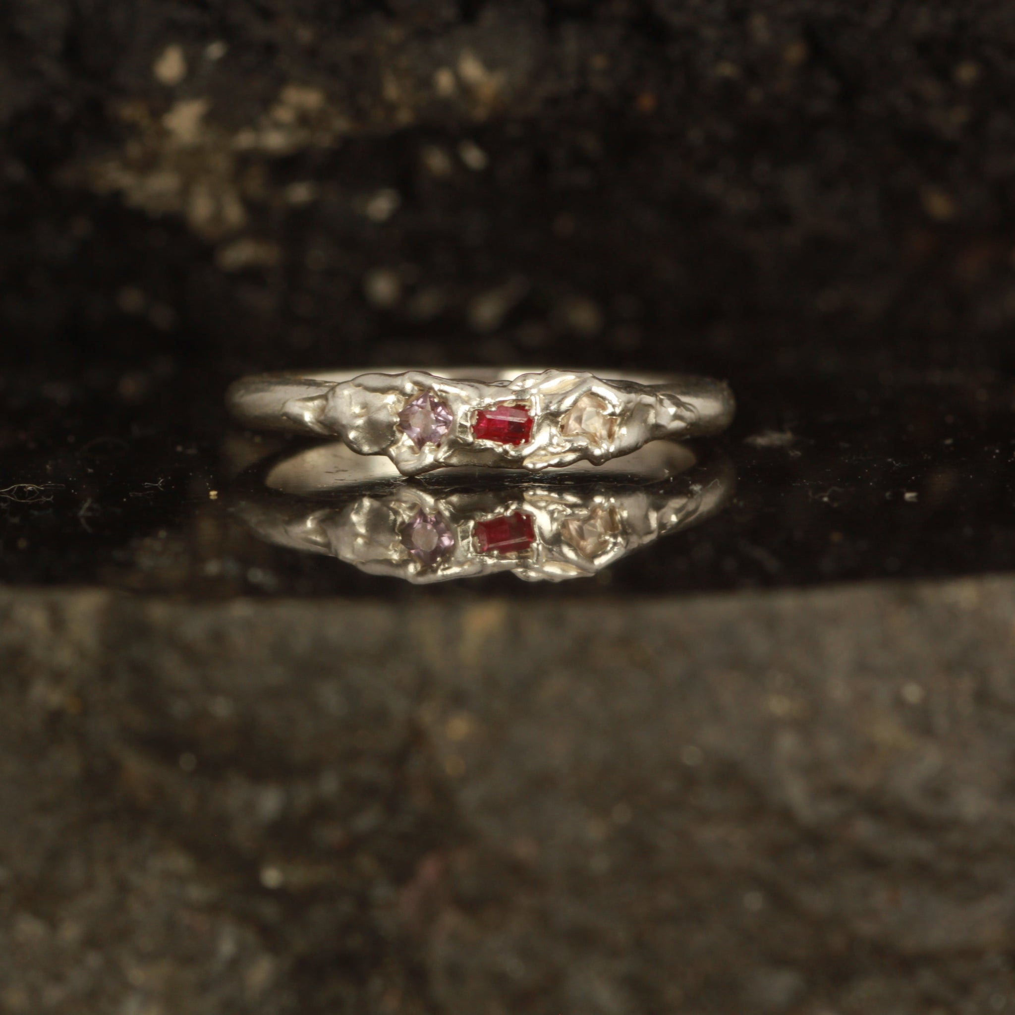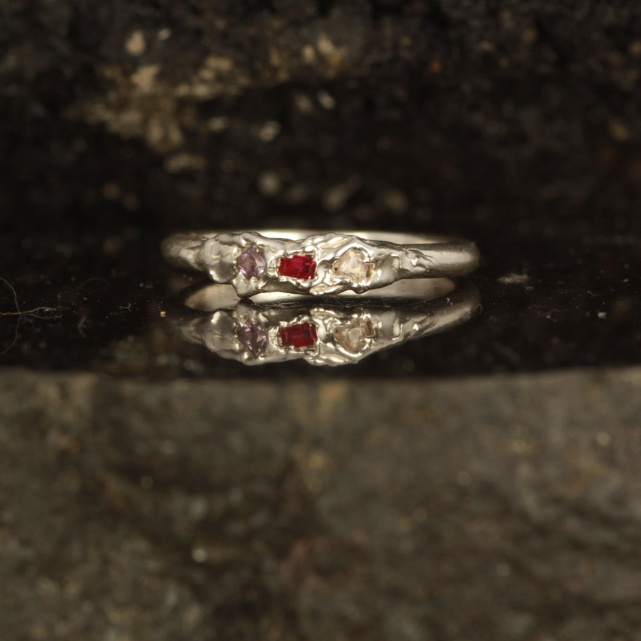 The pale pink sapphires on the sides were meant to be the same colour but one went clear in casting so I've reduced the price on this one.It's still cool and weird.