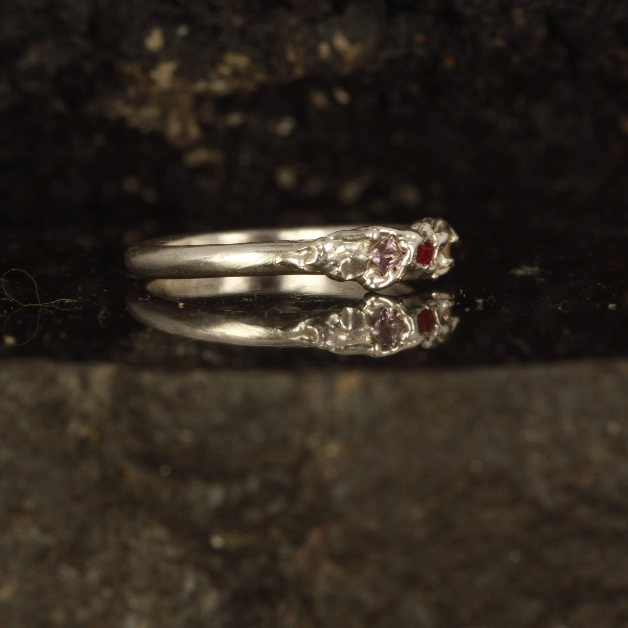 Solid 925 band with center ruby and pale pink sapphires set on either side.