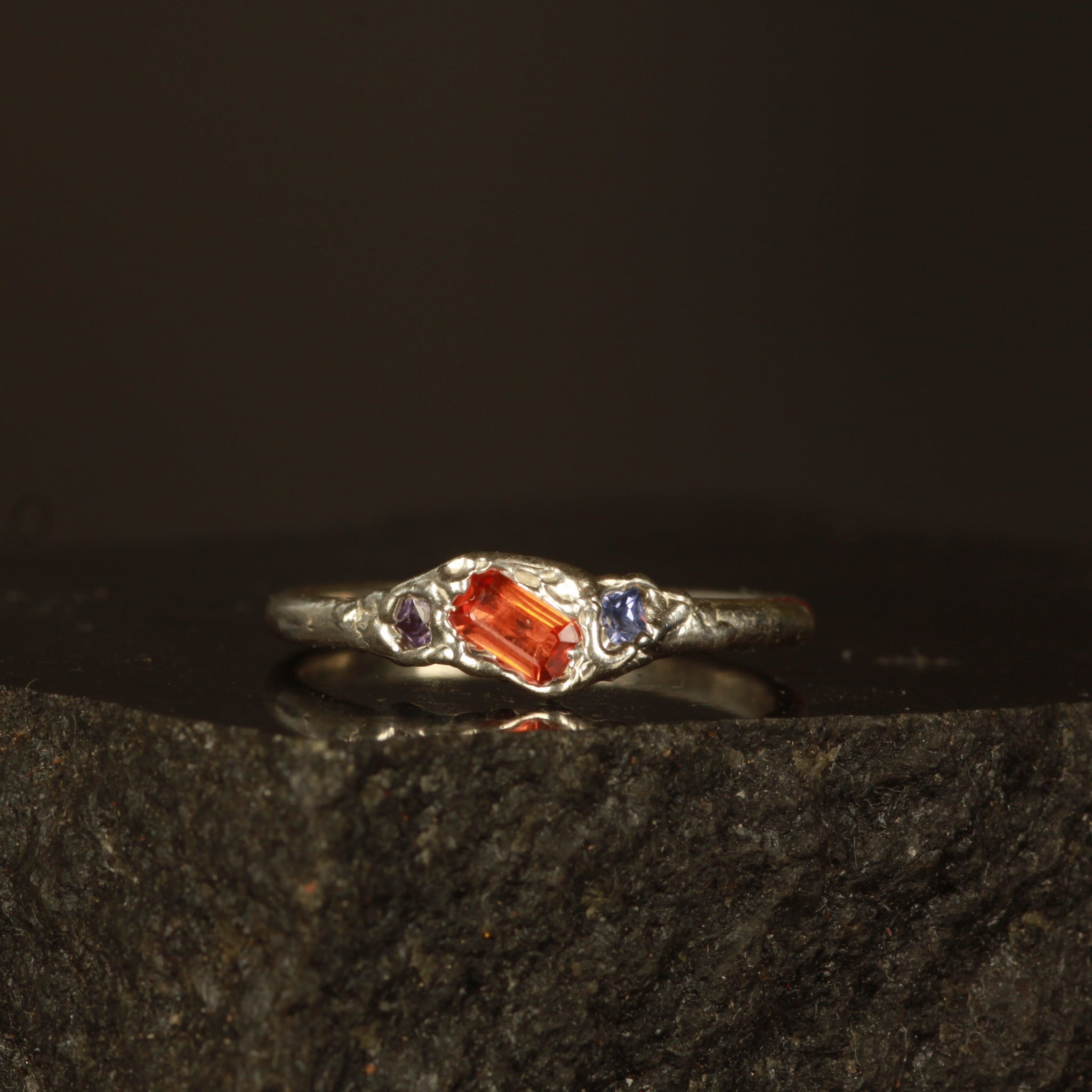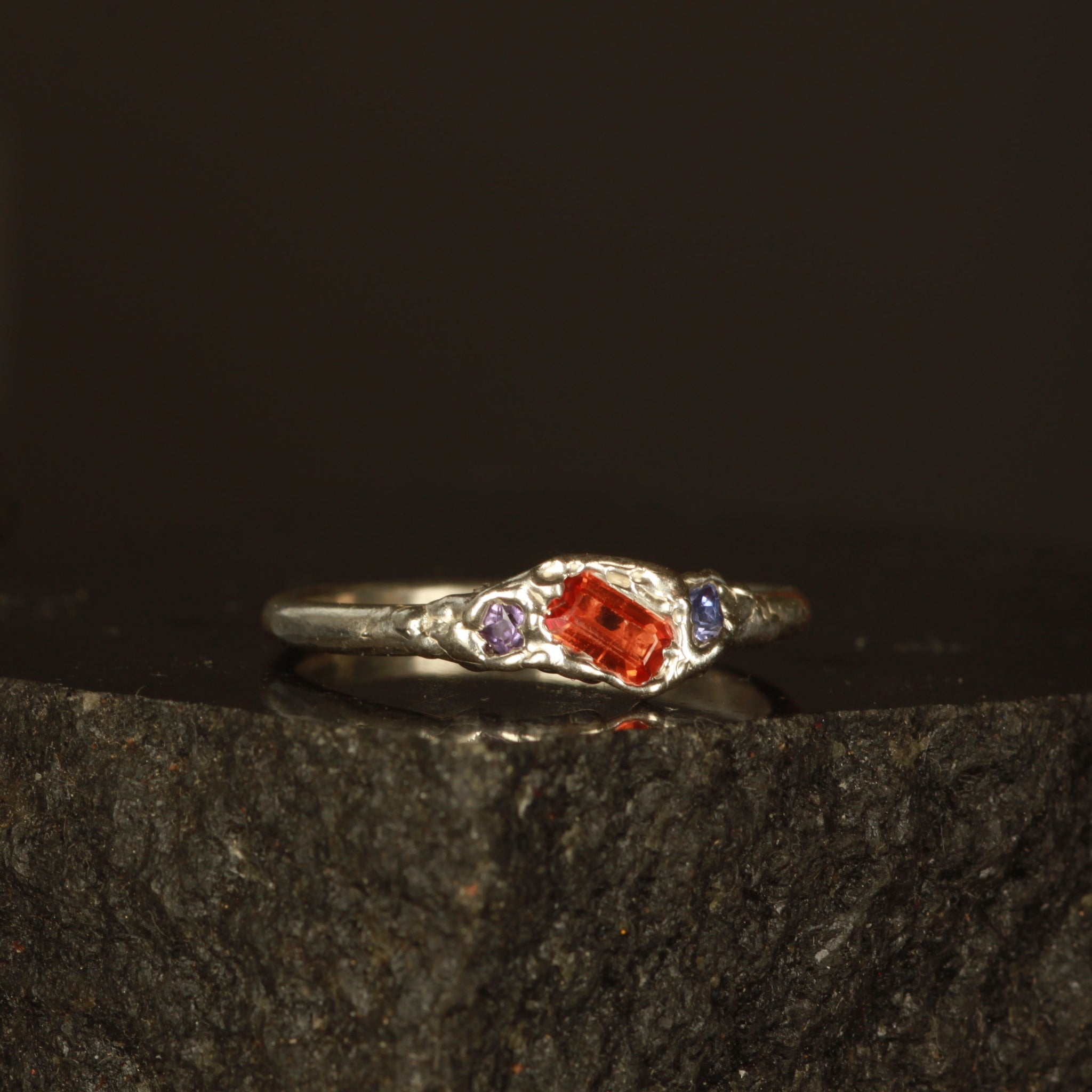 Solid 925 sterling silver with emerald cut orange sapphire set in the center, with purple princess sapphires set on either side.